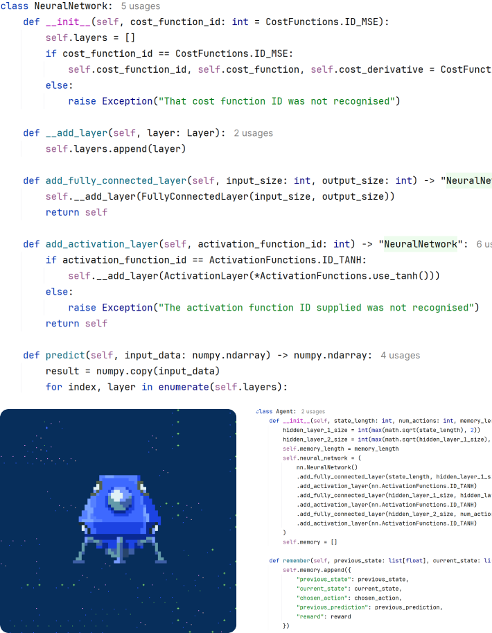 Jonathan’s bespoke project explored reinforcement learning and advanced game AI in Python. He began by developing his own neural network API, giving him the ability to create and train regression models from scratch using any 1D dataset. From there, he progressed into reinforcement learning, designing Q Tables and implementing Deep Q Learning to train agents for tasks such as obstacle avoidance and Snake.
