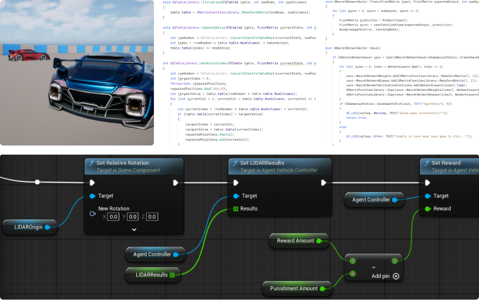 His bespoke reinforcement learning project in Unreal Engine brought all of these skills together, resulting in a university-level driverless racing simulation that reflects both technical depth and real creativity.